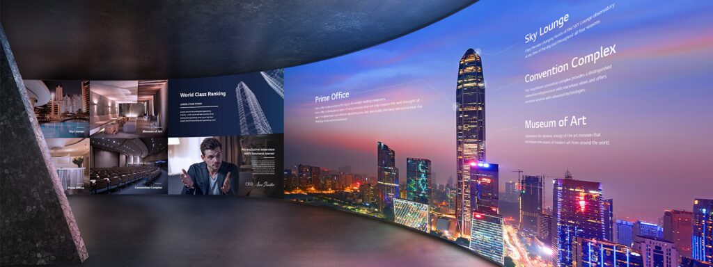 A large-format display utilizing LED (Light Emitting Diode) technology, delivering high-resolution images with vibrant colors and sharp clarity from every angle. It is ideal for a wide range of applications such as hybrid meeting rooms, event stages, showrooms, retail storefronts, shopping malls, stadiums, and even public spaces. The screen can be customized in size and shape with great flexibility to meet customer needs.